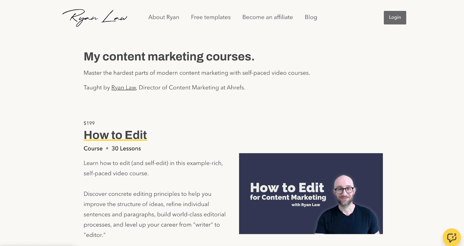 Ryan Law, Director of Content Marketing at Ahrefs, sells digital products on his websites, such as courses and templates, to people who want to improve their writing skills.