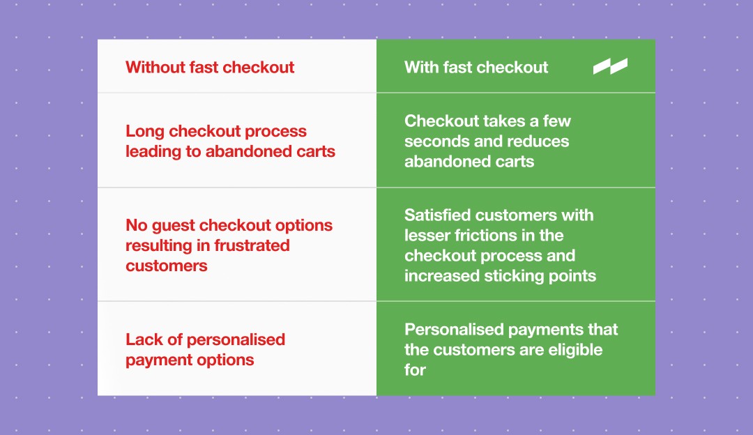 73% of online shoppers abandon shopping carts due to a long checkout. A fast checkout solution ends this by personalising the checkout experience and reducing human efforts (like filling in billing details every time). Faster checkouts account for reduced cart abandonment