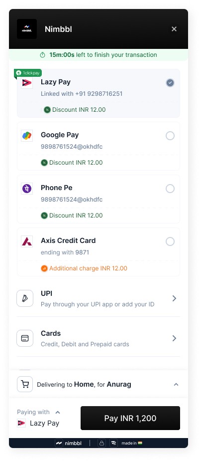 Nimbbl’s one-click, fast checkout ensures faster payment completion and order placement with fewer clicks.