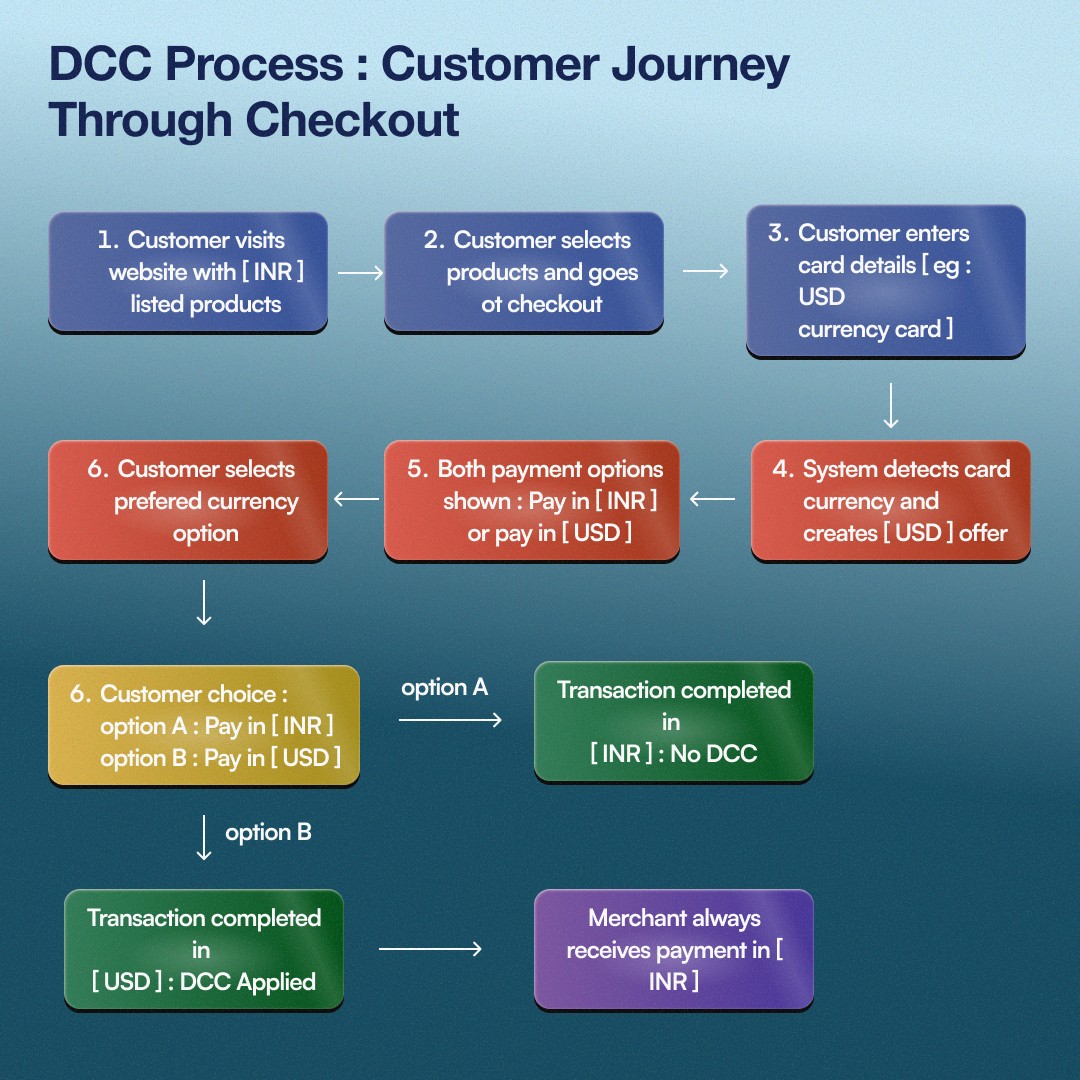 Dynamic Currency Conversion, aka DCC, is a financial service that allows international customers to see and pay for purchases in their home currency rather than the merchant's local currency. When a customer from another country makes a payment, DCC automatically converts the price from the seller's currency (like Indian Rupees) to the customer's preferred currency (like USD, Euro, or Pound) in real time at the point of sale.