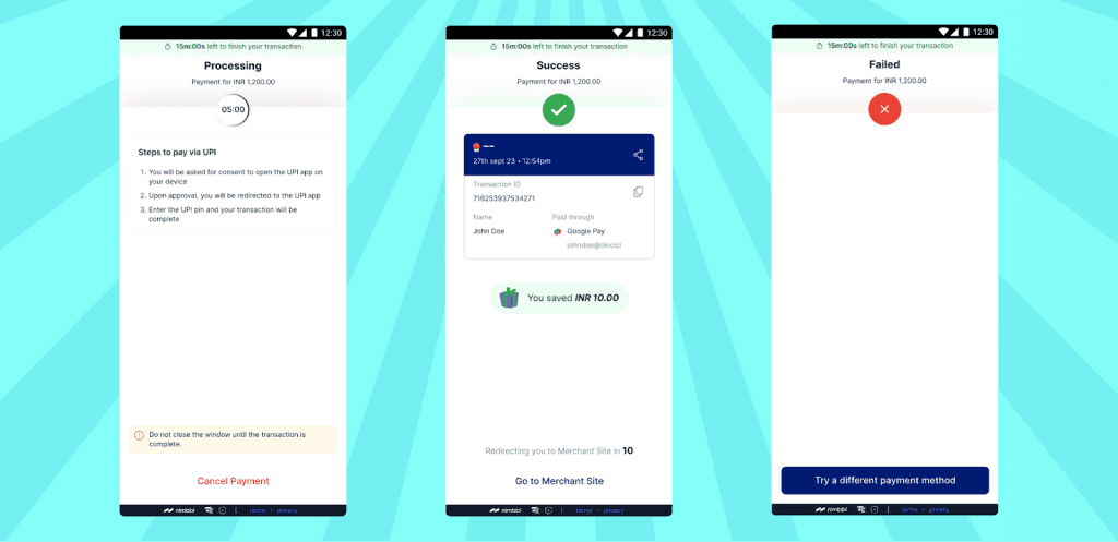 With intent flows and SDK-based checkouts, you can send payment details directly to the UPI app while preserving the customer’s order context. Once the payment is done, the customer is redirected back to your app or website with purchase confirmation.