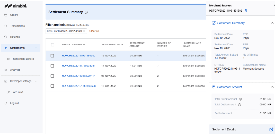 You can manage all your settled payments and check their history on Nimbbl’s payment settlement dashboard.