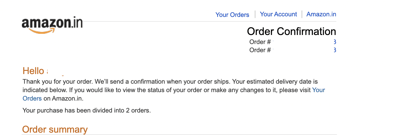 Your confirmation message is prime real estate for reducing future anxiety. Include order tracking links, expected delivery dates, or return policy reminders. Amazon India's approach of mentioning their easy returns right in the payment confirmation turns a transaction receipt into a trust-building opportunity.