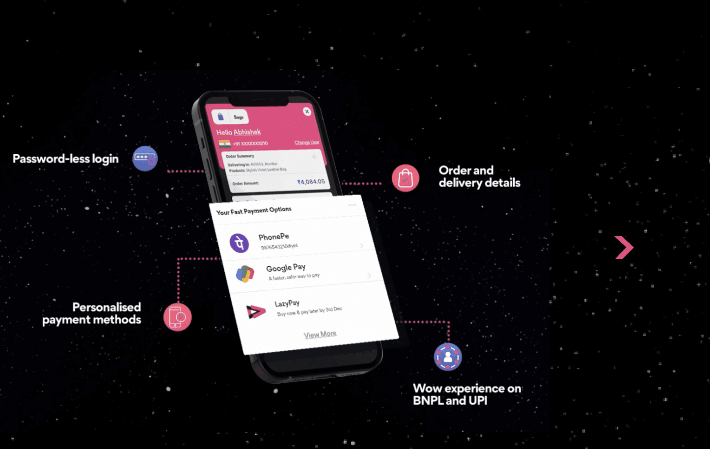 One-click checkout: Complete the entire checkout process within a few seconds with no-code integration and featuring eligible payment methods to enable OTP-less transactions